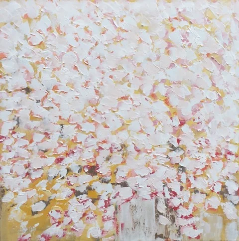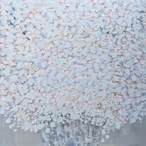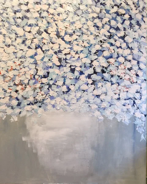 Kim's experience in interiors, food presentation, and garden design has resulted in a natural relationship between colors and texture, her work evokes both a "feeling of intrigue and calm". Kim is introducing a few new paintings this spring to her collections of Hydrangeas and Beach Towels, two different series that she is recognized for. The floral collection appeals to many with a love of nature, flowers, soft color, and again, the tactile quality.